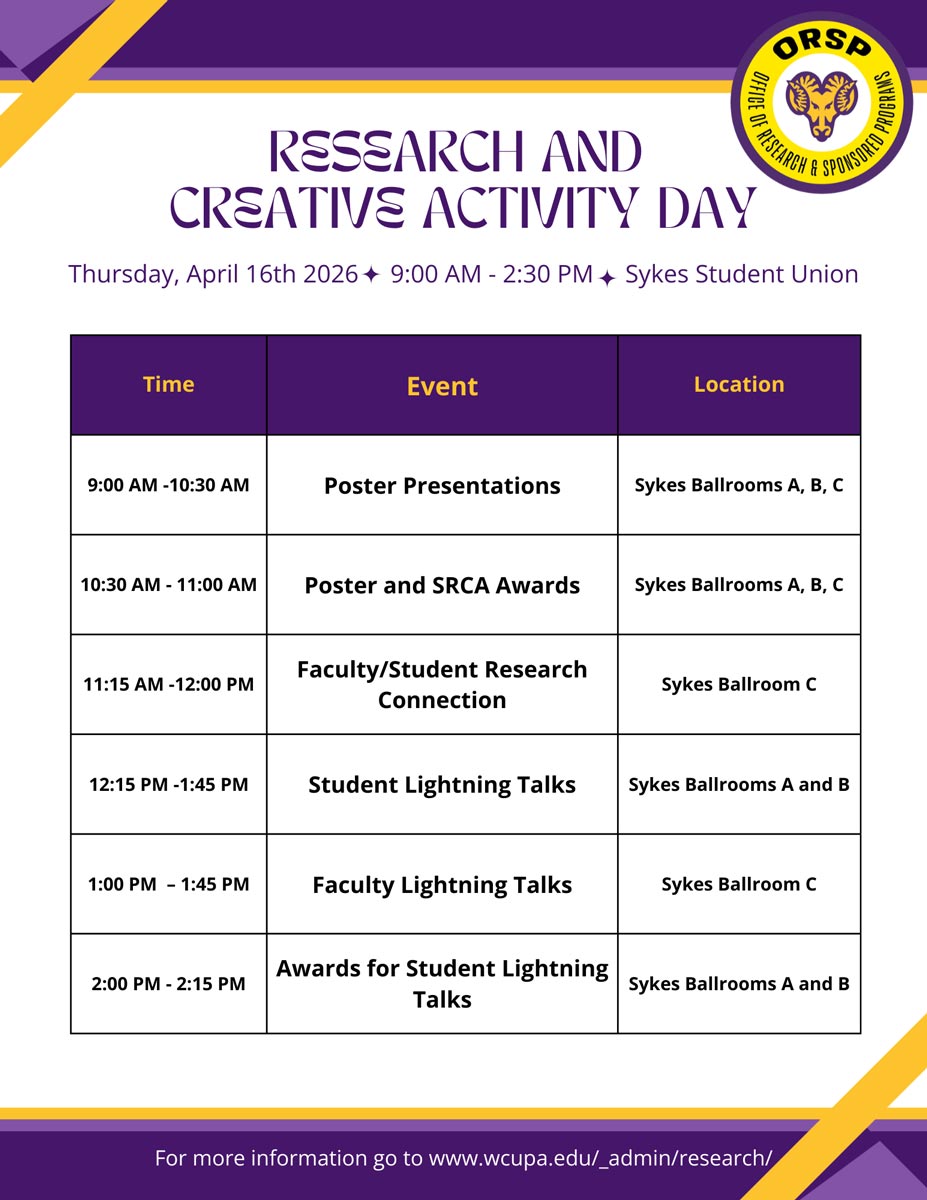 You’re invited to Research & Creative Activity Day, highlighting student, faculty, and administrator research from all academic disciplines across our campus community. The event showcases poster presentations, oral presentations and awards presented in each category.