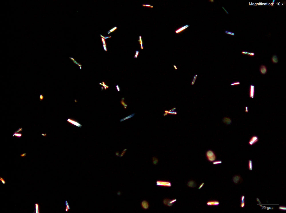 Bromo-DragonFLY in 10% hydrochloric acid gives small brown branched combs. These structures are best observed under crossed polars or higher magnifications. The crystals take 15 minutes to grow after reagent addition with Bromo-DragonFLY amounts less than 10 μg.