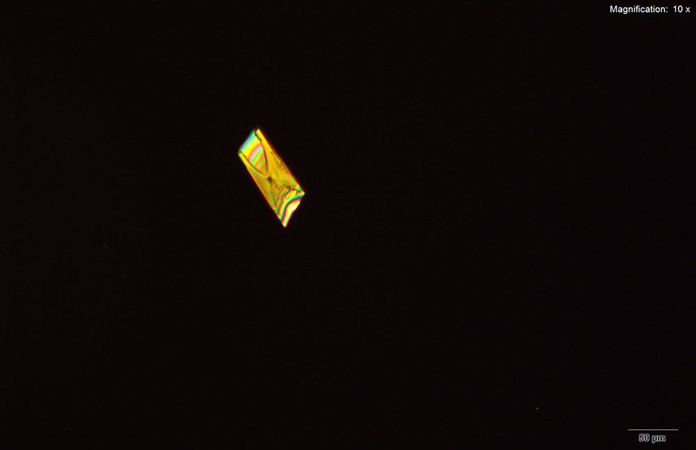 Crystals observed for Bromo-DragonFLY with platinic bromide are somewhat similar to those observed with platinic chloride. Short, thick, yellow, tablet-like prisms are observed. Variations to the prisms include pyramids and shards.
