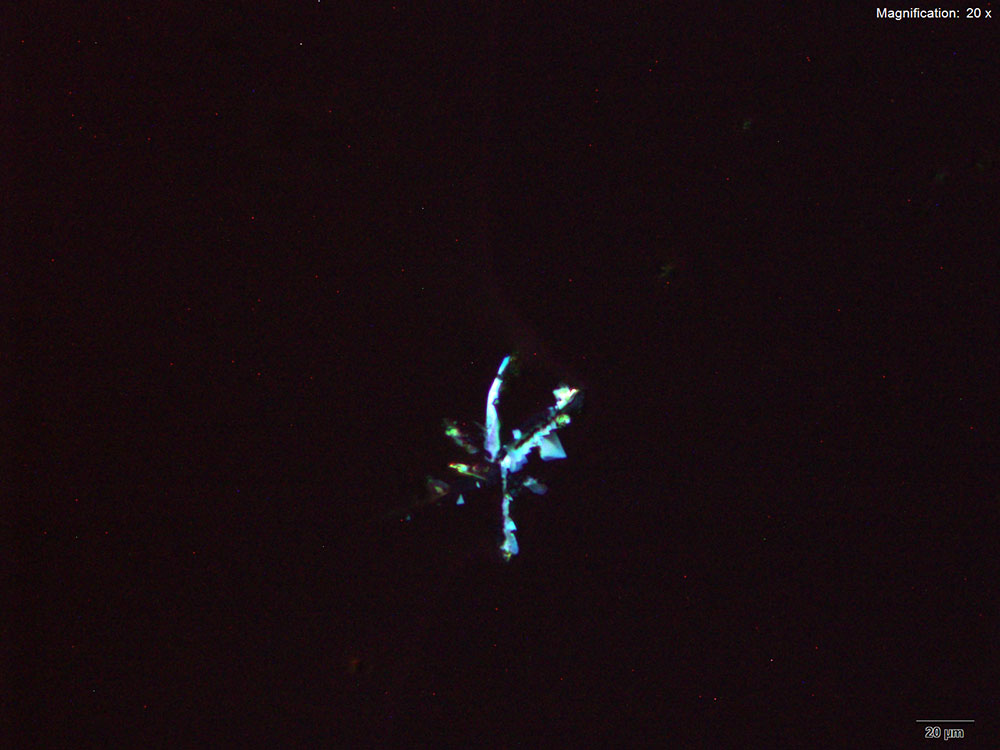 In the acidic gold chloride reagent, 3,4-MDPV forms colorless, light and leafy skin on the surface of the drop after the initial intense oiling observed. This leafy growth and its features are best visualized under crossed polars. On slow dissipation of the oiling, small insect-like clusters of plates are observed alongside the skin. These crystals are best formed at high concentrations of 3,4-MDPV.